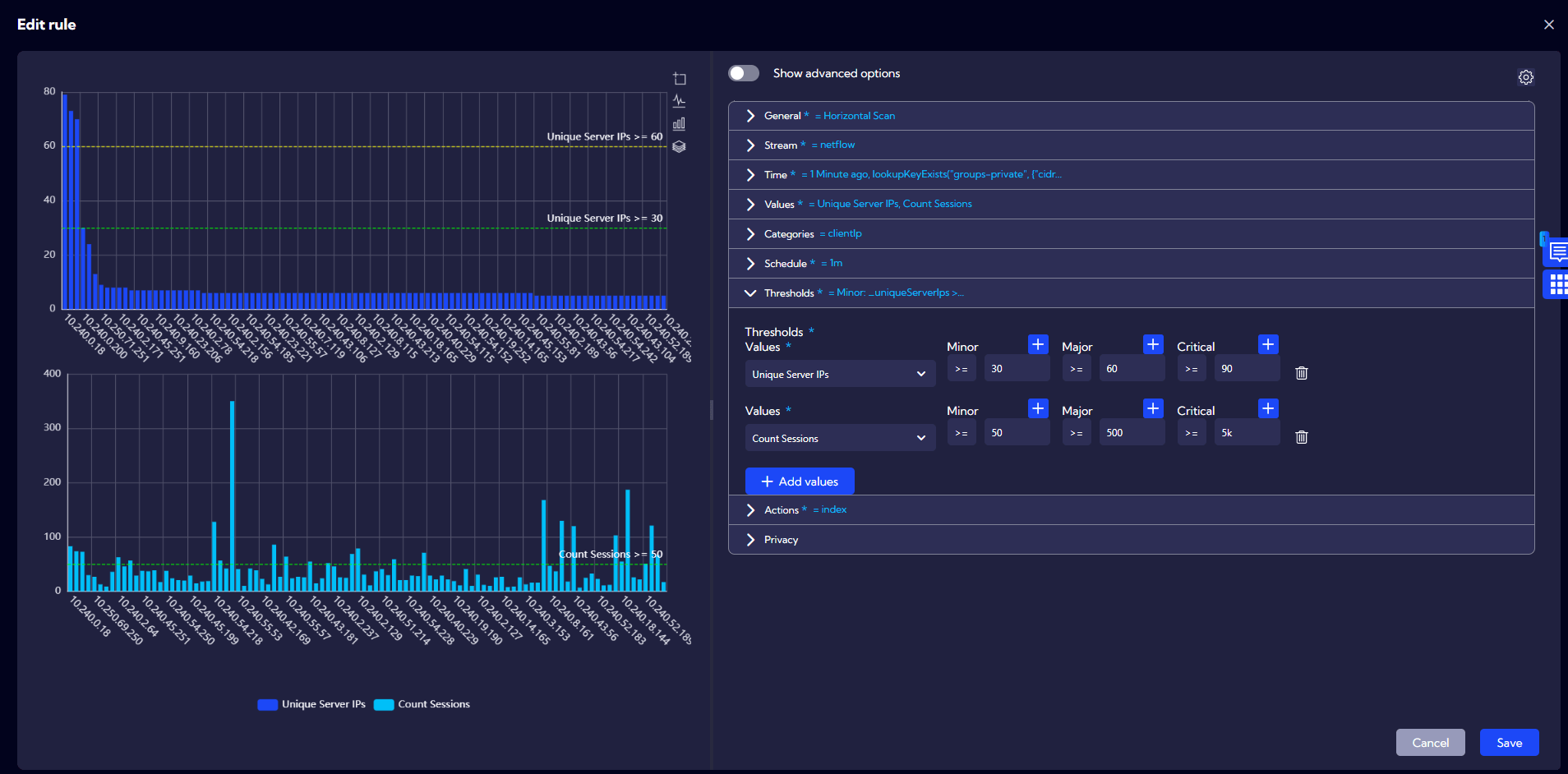 Sycope Security is a set of multiple rules used to detect volumetric and quality anomalies in network traffic. Among the nearly 60 detection methods are methods for detecting horizontal and vertical network scans. The idea behind them is to calculate the number of unique address and port pairs and the number of sessions established.